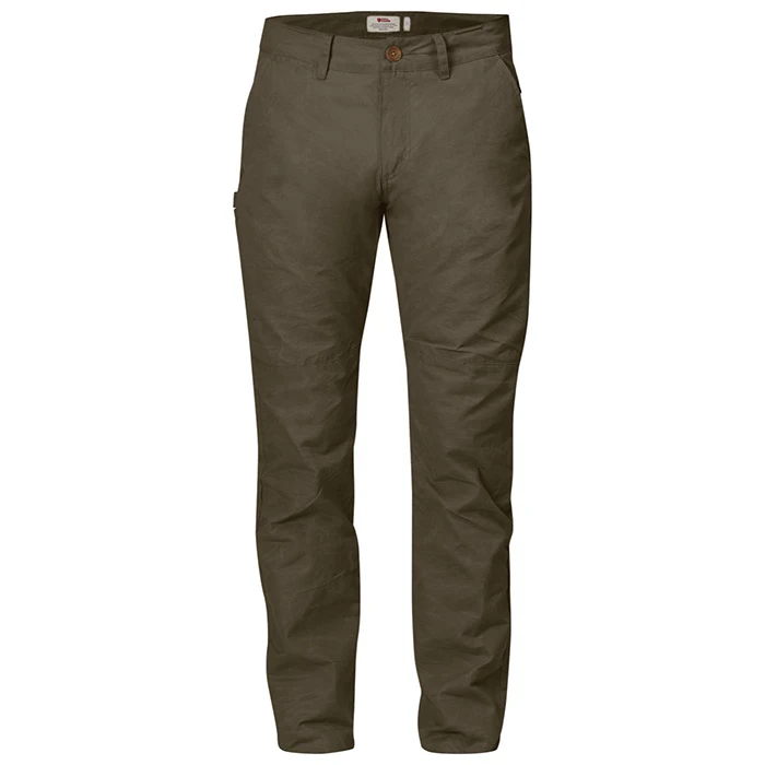The Sormland Tapered Trousers from FjallRaven are a comfortable hunting trousers in hardwearing, quiet G-1000 Silent Eco with tapered legs that fit easily into a pair of rubber boots. Developed for easier hunting in timeless, simple style making them just as suitable on the shooting range and they have every chance of becoming favorites for everyday use as well. The fabric is weather and wind resistant and effectively ventilates out moisture. The fit is regular with a mid waist that is slightly higher at the back so they sit comfortably when squatting down or carrying a backpack with a hipbelt. There is a knife pocket on the right-hand leg, hand pockets and back pockets with buttons. Reinforced brace zones for easy attachment of braces.