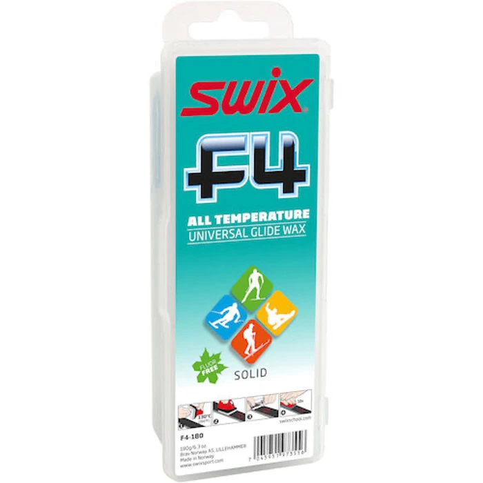 Swix is committed to a Fluoro-Free option, without sacrificing performance and ease of use. The F4 series is now part of Pure series of waxes that contain no harmful elements to the environment, so you can sleep easy knowing you ll be going faster with no environmental impact The reason why Swix F4 Pure Wax is so popular is because it works! Improved glide, convenience, and wide temperature range. F4 high quality water-repellant Pure wax for skis and snowboards in all snow conditions. Iron in, scrape and brush.