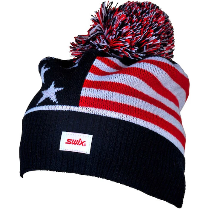 Perfect for winter active or casual wear, the retro styling of the Swix US Pom beanie comes alive with red, white and blue pride in an acrylic knit cap with a soft microfleece headband. Itch-free acrylic knit construction with a supersoft microfleece headband Cuff style brim; topped off with a stylish small pom.