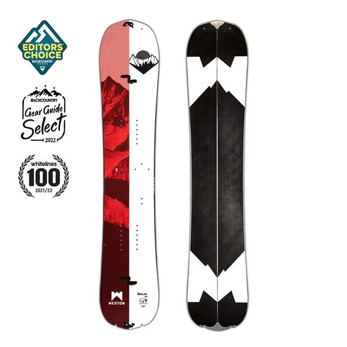 The Ridgeline is the peak of Weston’s freeride line – built to float in powder while giving you an unrelenting edgehold at high speeds on steep and variable terrain. Featuring a Directional Multi Radial Camber-Rocker (Camrock) profile and a longer sidecut, the Ridgeline provides float in deep snow, while avoiding too much taper that might cause the board to wash out easier on icy slopes. Weston added in their Rugged Topsheet made from castor bean oil for durability & snowshedding, and a top of the line Sintered Base with clean black graphics for unrivaled speed as well as ease of p-texing and repair. Additionally, the Ridgeline features Weston’s Vertical Laminate and Tail V Carbon with one of their most sophisticated and sustainably harvested paulownia, poplar and bamboo cores to shave a touch more weight than their popular Backwoods model while providing reliable edgehold, snap and dampening required of higher speeds. The Ridgeline is a freeride board at its core, but Weston made the flex more approachable to be a stellar all around daily driver on resort corduroy or off piste.
